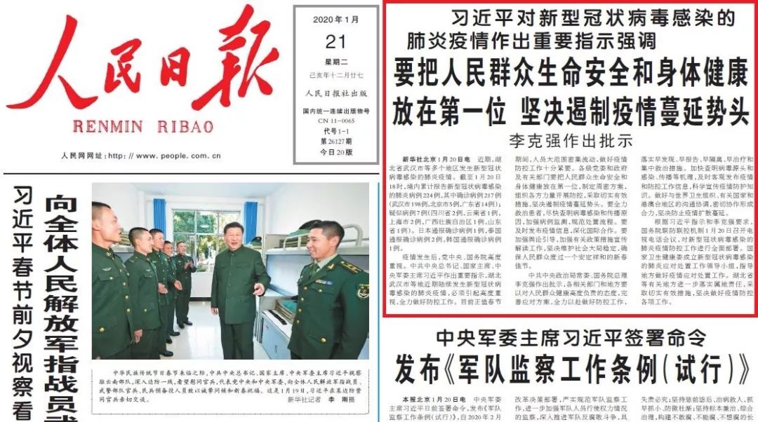 2020年1月21日,《人民日报》头版报眼位置报道习近平总书记重要指示