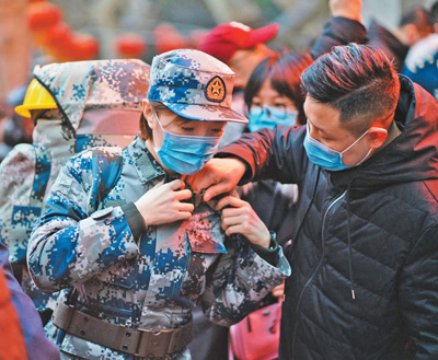 24日,空军军医大学医疗队受命紧急驰援武汉,这是前来送行的队员家属为队员整理背囊。 |