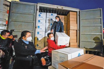 25日,工作人员在搬运医疗队带往武汉的医疗物资。当日,首批江苏援湖北医疗队从南京集结出发,奔赴武汉。 |