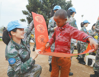在另一侧,笔墨已经备好,官兵们写下了一个个“福”字。医疗分队副队长汪惠文触景生情,现场挥毫书写了一副对联:“中非合作写发展 坚守使命谱新篇”。很多孩子跃跃欲试,要亲手学写毛笔字。13岁的萨杰写下“大爱无疆”,骄傲地给官兵们欣赏,原来他曾经向维和官兵学习过书法。“我爱中国,也喜欢中国文化,我要努力学习,长大后到中国去看看。”萨杰说。