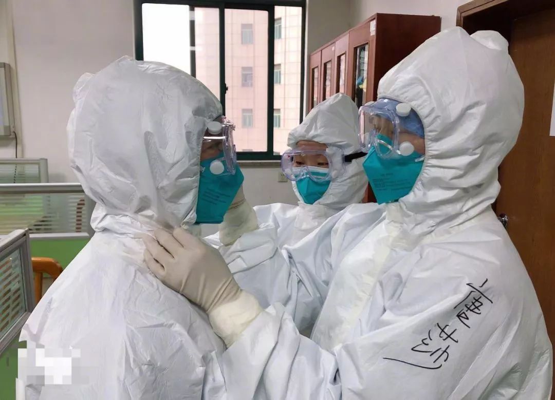 因为穿了隔离衣认不清谁是谁, 医护人员互相在 背后写上了名字并打气: 加油! 棒棒哒!