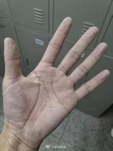 一名医护人员下夜班后摘下手套,他的手变得皱皱巴巴, 长时间穿着厚厚的防护服,手才出了很多汗......