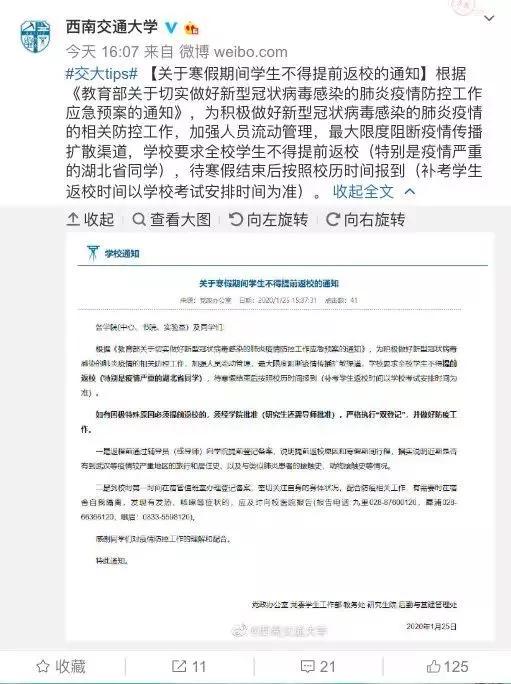 西南交通大学发布《关于寒假期间学生不得提前返校的通知》称,学校要求全校学生不得提前返校(特别是疫情严重的湖北省同学),待寒假结束后按照校历时间报到(补考学生返校时间以学校考试安排时间为准)。