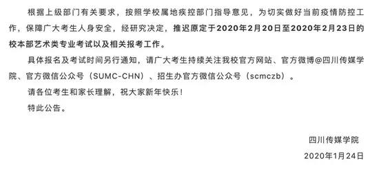 推迟原定于2020年2月20日至2020年2月23日的校本部艺术类专业考试以及相关报考工作,并延期2019级学生军训。