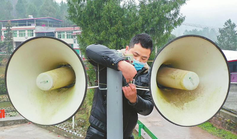 2月1日,南江县元潭镇康家岭村村干部在维护安装在村口的大喇叭,确保村民人人能听见肺炎疫情防控知识的宣传。 肖定怀摄(视觉四川)