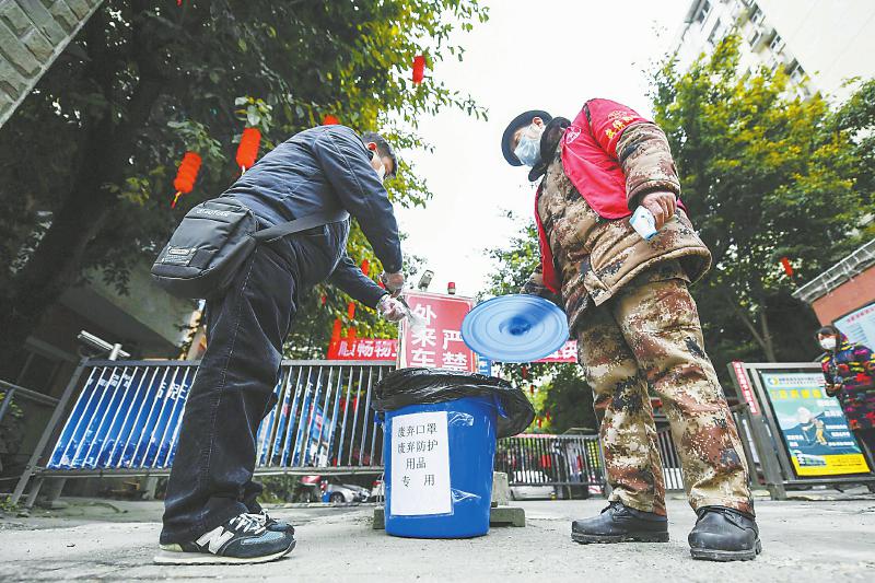 成都市武侯区顺和社区居民、“武侯好邻居·平安志愿者”王润劳监督居民将废弃口罩剪碎丢入专用垃圾桶,防止被回收利用。 本报记者杨树摄