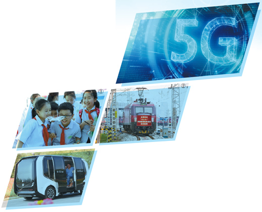 图①:5G无人机体验。图②:5G+AI铁路智慧机务系统。图③:5G微公交。