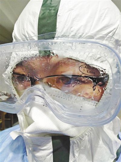 9日,国家紧急医学救援队(海南)队员、海南医学院第一附属医院医生程少文承担武汉国际会展中心方舱医院的值班任务,不到两小时护目镜上的雾气就形成了大片积水。国家紧急医学救援队(海南)供图