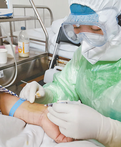2月8日,武汉同济医院中法新城院区重症隔离区,山东援鄂医疗队护士正在给一名感染者送药。环球时报记者 崔 萌摄