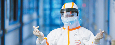 2月8日,山东援鄂医疗队护士在武汉同济医院中法新城院区重症隔离区为自己鼓劲打气。环球时报记者 崔 萌摄
