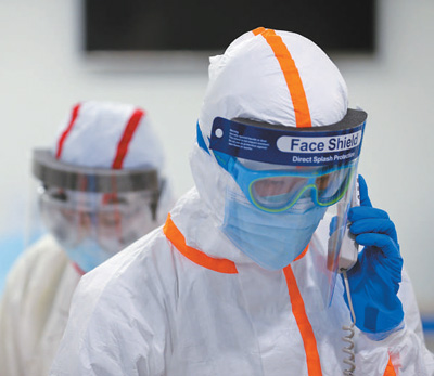 2月5日,在湖南衡阳南华大学附属南华医院,医护人员穿好防护服经过缓冲区走向隔离病房。曹正平摄(人民视觉)