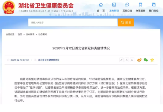 2月13日,湖北省卫健委通报,2月12日湖北省新增新冠肺炎病例14840例(含临床诊断病例13332例),与前一日相比,湖北确诊病例数大幅增加。国家卫健委表示,随着对新型冠状病毒肺炎认识的深入和诊疗经验的积累,针对湖北省疫情特点,国家卫生健康委办公厅、国家中医药管理局办公室印发的《新型冠状病毒感染的肺炎诊疗方案(试行第五版)》在湖北省的病例诊断分类中增加了“临床诊断”,以便患者能够早诊早治,进一步提高救治成功率。