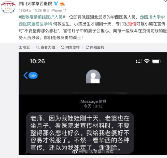 四川大学华西医院重症医学科医生何敏给医院官方微博小编发的一条短信