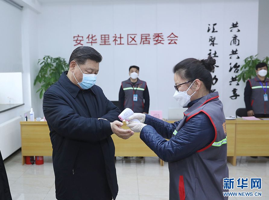 2月10日下午,习近平总书记来到北京市朝阳区安贞街道安华里社区,实地了解基层一线疫情群防群控等情况。总书记戴口罩、量体温的画面,瞬间在网上刷屏(图片来源:新华网)