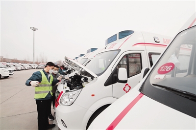 山东潍坊赶制负压救护车驰援武汉。图为在位于潍坊的福田山东多功能汽车厂,工作人员对负压救护车进行检测、调试。新华社发