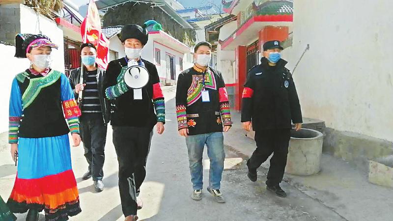 ④在凉山州甘洛县波波乡,党员干部进村入户,向彝族群众宣传新冠肺炎防护知识。(省民族宗教委供图)