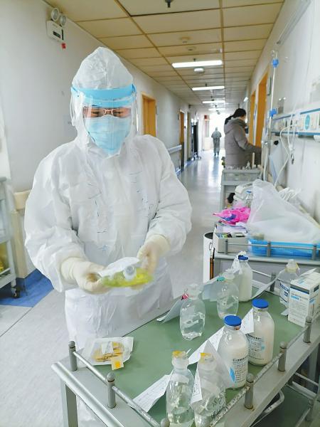 ①农工党党员、广元市中心医院院感科科长王德明在武汉市红十字会医院重症病房外检查药品。(农工党四川省委供图)