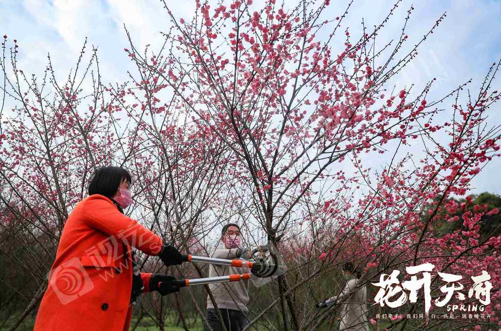 ▲华蓥市禄市镇小驴山村的村民,在生态园给相继开放的梅花修除残枝。