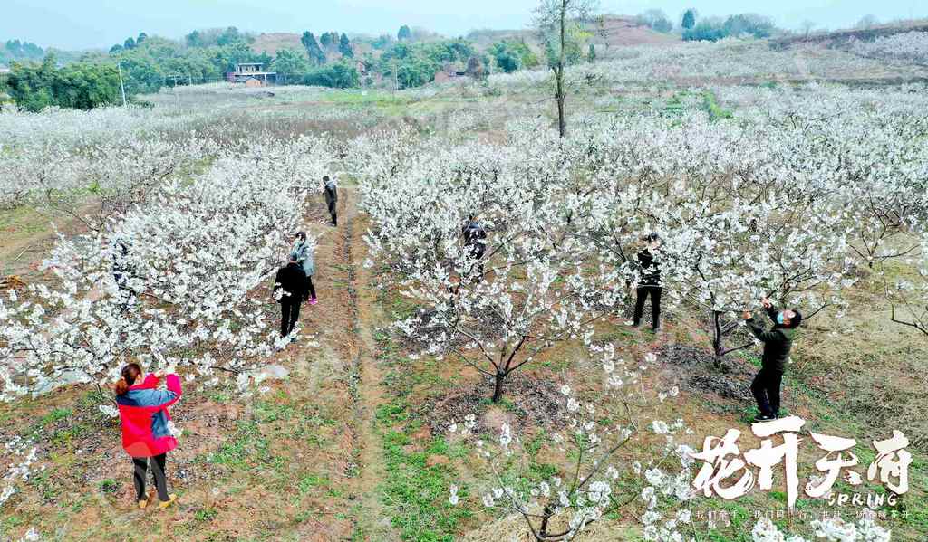 ▲仁寿县怀仁街道吊庆社区,果农们正在对樱桃树进行疏花。
