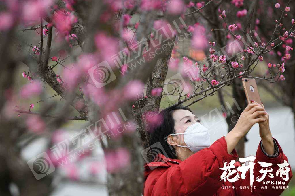 ▲遂宁市船山区永兴镇春梅盛开,人们戴着口罩赏花休闲。