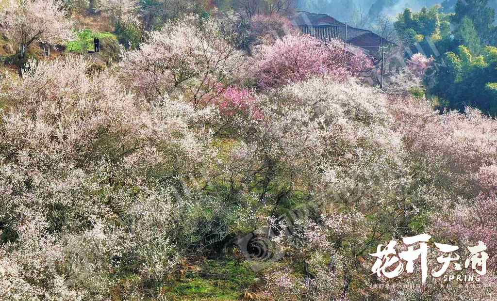 ▲南江县关门镇石庙村和宝峰村盛开的梅花,将山村妆扮得如同一幅精美的田园风光画。
