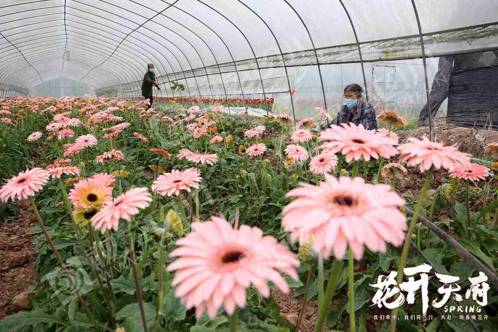 ▲内江市东兴区田家镇,韩娟种植专业合作社的农民正在大棚里管理花卉。