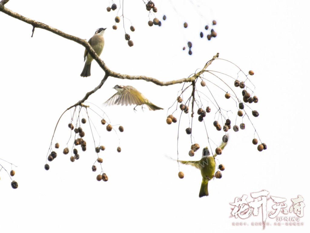 ▲阆中市柏垭镇,鸟儿在苦楝树上觅食。