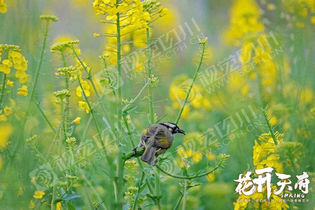▲遂宁市大英县,一只小鸟在啄食油菜花瓣。
