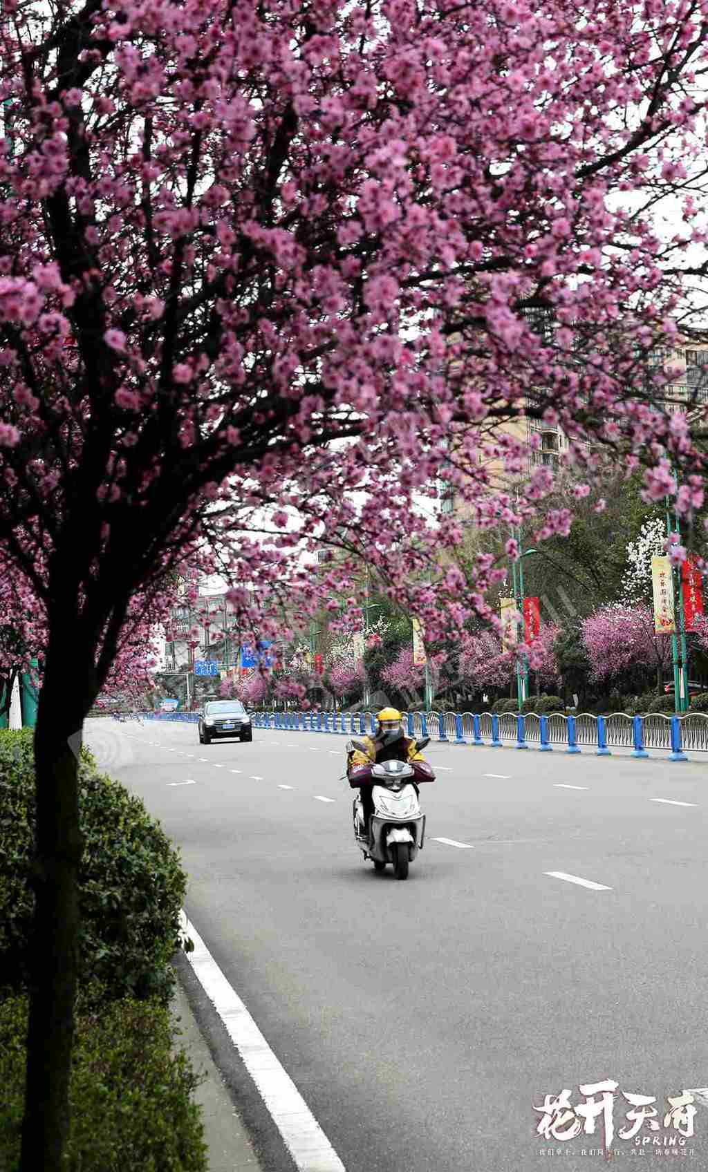 ▲眉山市东坡区岷江大道,戴口罩的市民骑车从梅花绽放的道路经过。