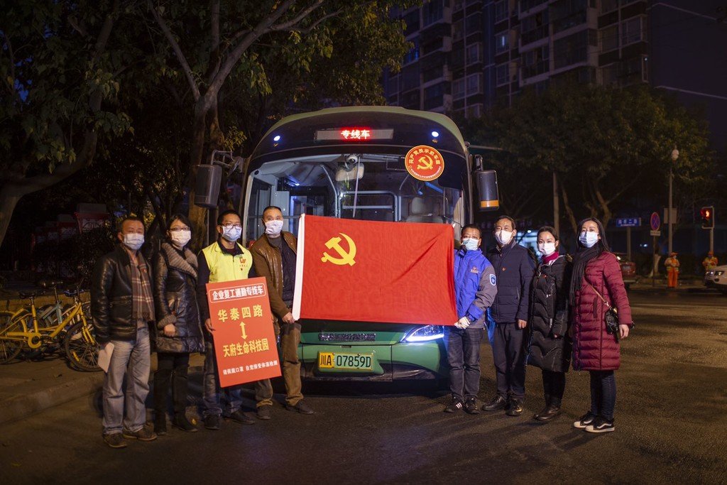 成都地铁公司、成都公交集团组建党员先锋队,全面落实车站消杀、体温监测等防控措施,增加地铁发车班次,降低乘车人员密度,开通上线运行117条复工定制公交专线,日发车近400班,为近30万人次复产复工人员出行通勤“保驾护航”。