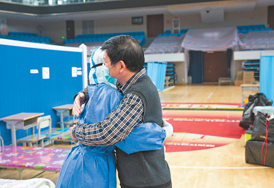10日,武昌方舱医院休舱在即,患者和照顾他的医务人员紧紧拥抱。本报记者 张武军摄