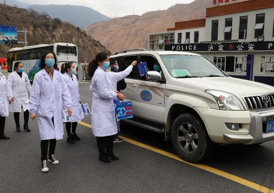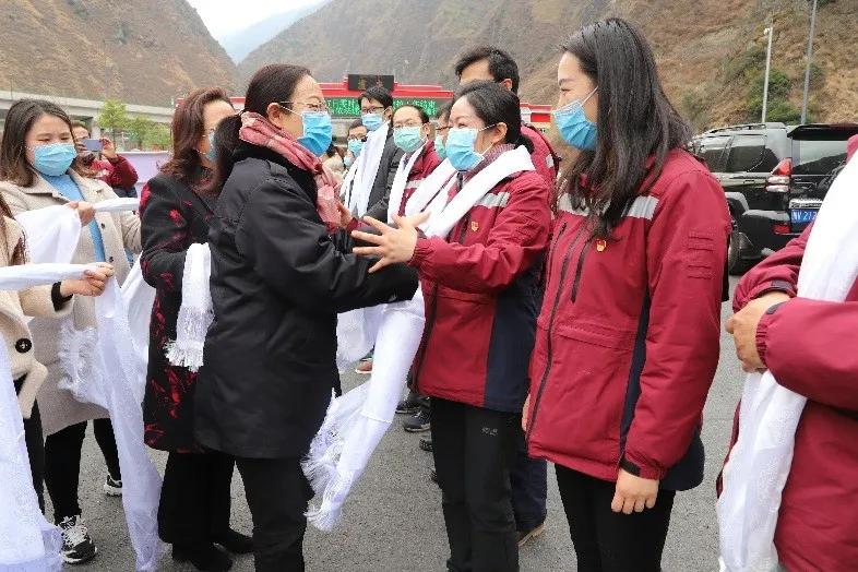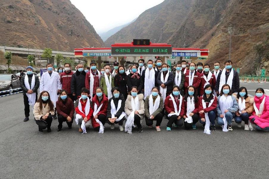 3月13日,在泸定县高速出口30余名医务工作者手捧洁白的哈达,为四川省卫健委派驻道孚前方工作组27名“最美逆行者”送行。