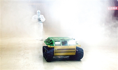 在武昌方舱医院,医护人员操作防疫消杀机器人消毒。新华社发
