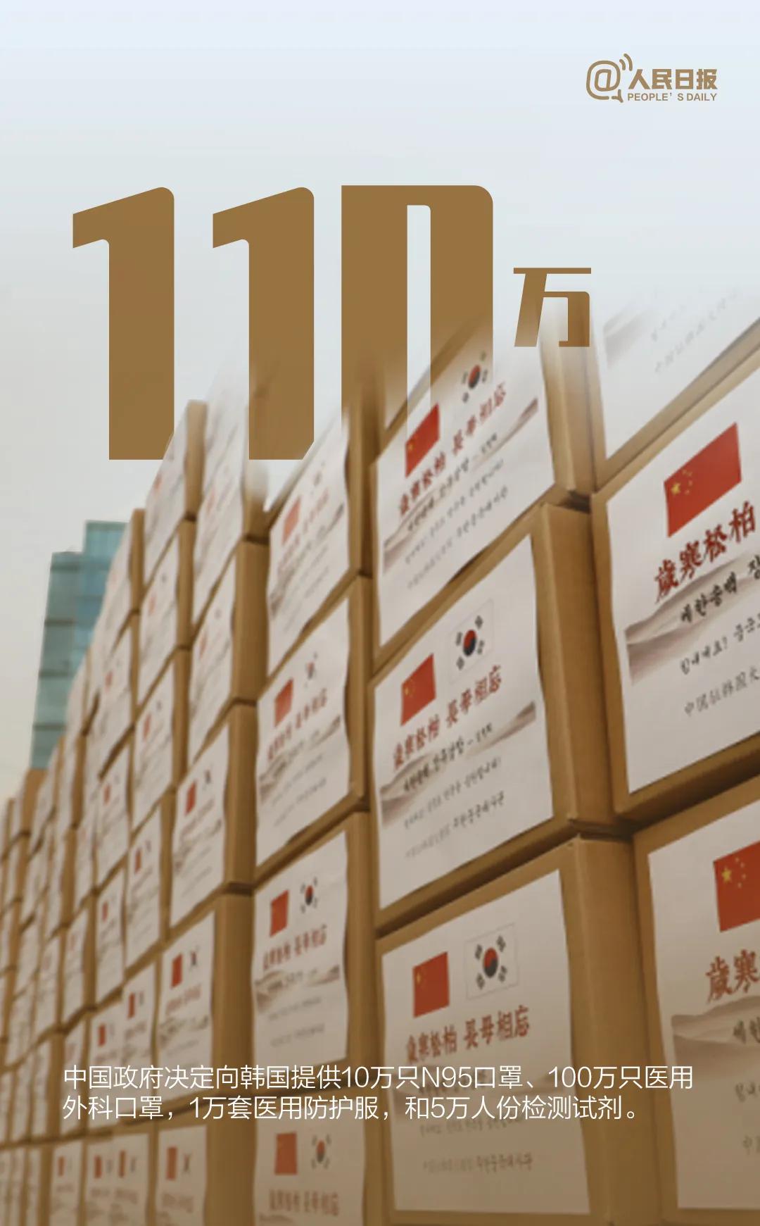 3月11日,中国政府向韩方提供的110万只口罩等物资援助中,首批8万只N95口罩和1万套医用防护服抵达仁川机场。此前上海市、威海市、南京市、绍兴市政府已向韩国陆续捐赠大批口罩及防护服、护目镜等其他医疗物资。