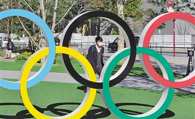 3月12日,在日本东京,一名戴着口罩的男子经过2020年东京奥运会主体育场附近的五环标志。新华社发