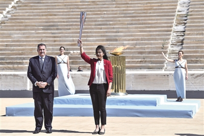 3月19日,日本代表团成员井本直步子(右)在雅典东京奥运会圣火交接仪式现场展示火炬。新华社发