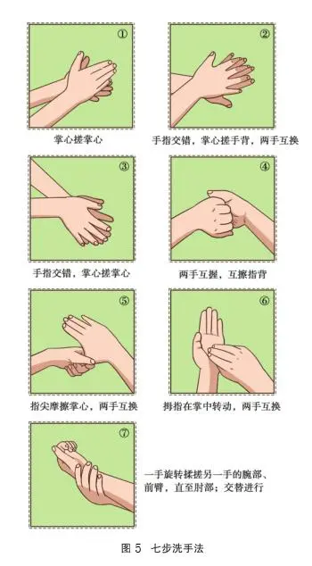 2.卫生设施保障。根据学校师生规模在适当位置增加水龙头数量,安放肥皂、洗手液等,在醒目位置张贴“七步洗手法示意图”(图5),满足师生员工洗手需求。合理设置相对独立的(临时)隔离室,用以暂时留观身体不适的师生员工,避免交叉感染。校门口和校园内设置专用的废弃口罩垃圾桶。学校要准备好充足的红外测温仪等测温设备,安排多通道体温测量点,避免入校时人员聚集。有条件的学校可在校门入口处设置红外热成像仪。