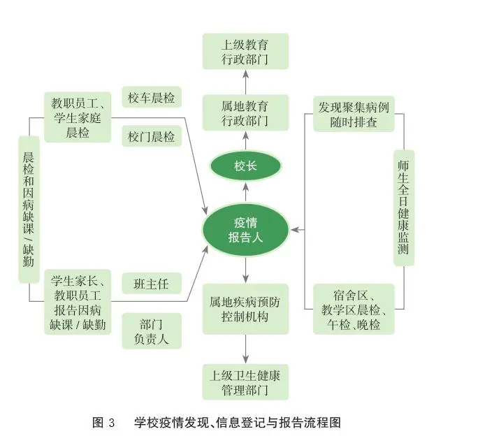 (1)应承担并履行学校疫情报告人的工作职责,在学校疫情防控工作领导小组的统一领导下开展疫情防控工作,全面掌握本校师生员工因病缺课、缺勤情况,开展缺课、缺勤人员病因追踪。如发生突发公共卫生事件,要协助学校在规定时间(2小时)内向属地疾病预防控制机构和教育行政部门报告(图3)。