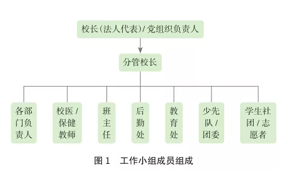 成立学校疫情防控工作领导小组,由校(园)长(法人代表)担任组长,成员包括学校领导班子成员、校医(保健教师)、班主任、后勤处、教育处、少先队、团委、学生社团负责人及志愿者等,全面负责学校防控新冠肺炎疫情工作。领导小组下设办公室和信息汇总组、疫情应急处置组、宣传组、防疫物资统筹组和后勤服务保障组等,各项工作须任务明确、分工清晰、职责分明、责任到岗、任务到人(图1)。