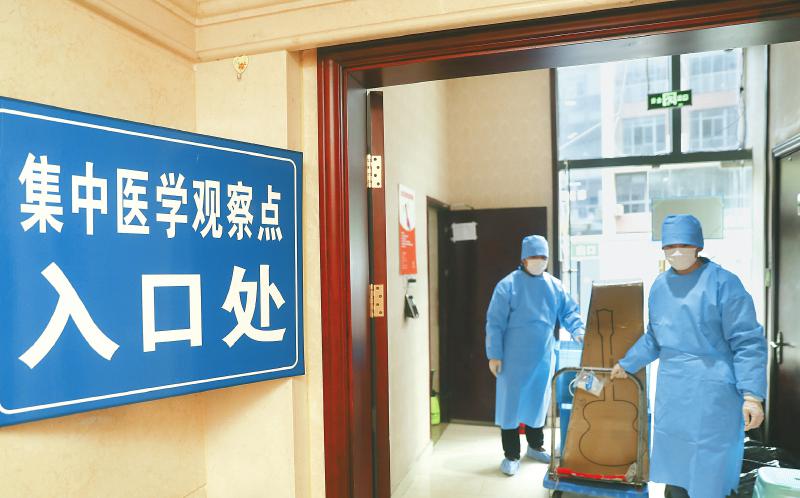 3月30日,在上海市松江区的集中隔离观察点,工作人员将隔离人员的快递运送上楼。 新华社记者 丁汀 摄