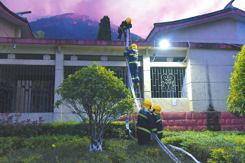 西昌泸山景区光福寺现场,火线距光福寺大殿仅400余米。消防人员现场布置3道防线,接通寺庙内12处消防供水通道,多辆消防车及市政供水车现场值守。