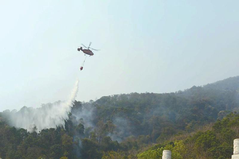 4架直升机从空中支援,空地联合对西昌森林火灾火场东北线和南线以及光福寺后山、五祖庵等地的林火展开扑救。