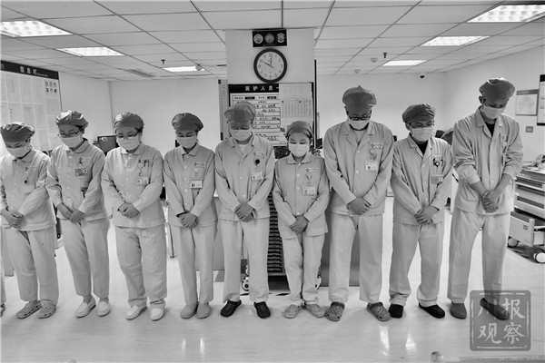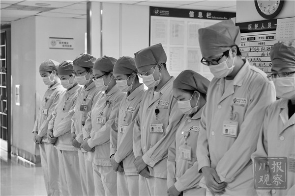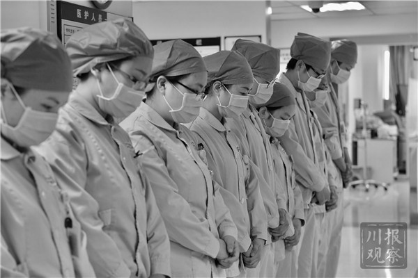四川一线医护工作者为烈士和逝者默哀