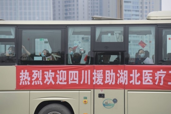 “蜀你最美”“欢迎回家”“英雄凯旋”,现场数百名群众举着高举各类欢迎标语,大巴车上的医疗队员也向群众挥手回应。