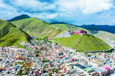 青海省玉树州高山环抱,碧水长流,蓝天白云下的玉树城宛如风景画一样美丽。韩加君摄/光明图片