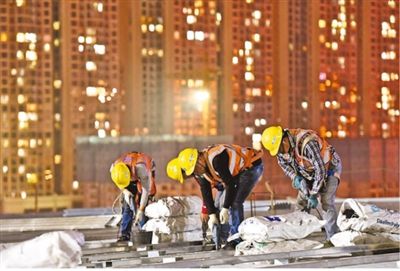 近日,在广西柳州柳东新区国际会展中心三期项目工地,夜班工人在屋面作业。 黎寒池摄(影像中国)