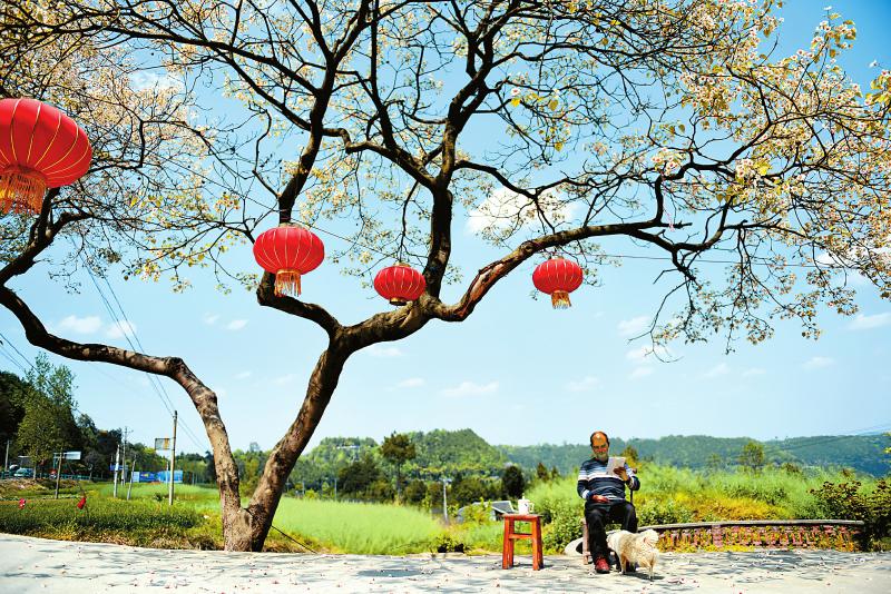 ③阆中一村民在家门口的桐树下看书。 王玉贵摄