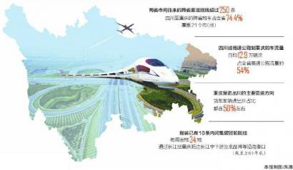 数据显示,截至2019年底,两省市间往来的跨省客运班线超过250条,四川至重庆的跨省班车占全省74.4%,覆盖21个市(州);四川经高速公路到重庆的车流量日均12.9万辆次,占全省高速公路流量的54%;在货运方面,重庆是进出川的主要货运方向,货车车辆进出川占比都在50%左右;内河水运方面,我省已有10条集装班轮航线,每周发班34班,通过长江经重庆抵达长江中下游及北部湾等沿海港口。
