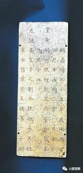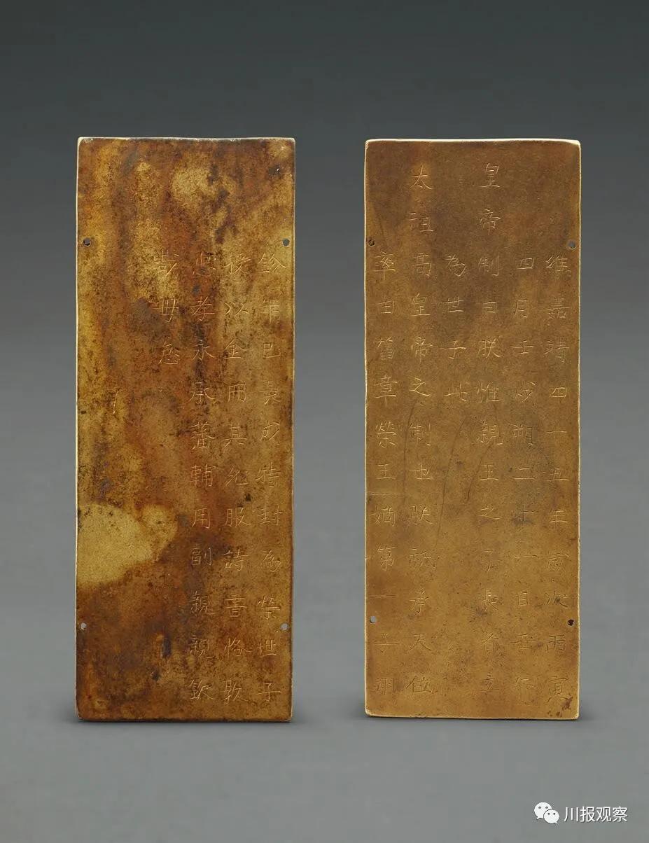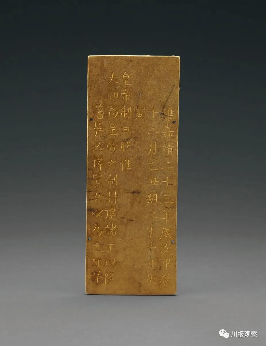这枚金册抢夺自藩王府,正面刻“維嘉靖二十三年歲次甲辰十二月乙丑朔二十六日庚寅皇帝制曰朕惟太祖高皇帝之制封建諸王以隆藩屏必擇賢女以為之配榮”等字样。