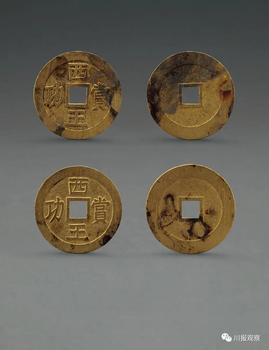 “西王赏功”金、银币,是张献忠作为大西王时嘉奖部将战功所用。在江口沉银遗址发掘之前,因为其存世稀少,一枚“西王赏功”金币在2011年嘉德士春季拍卖会上,以230万元的价格成交。江口考古发掘文物中,包括了数十枚“西王赏功”金、银币。
